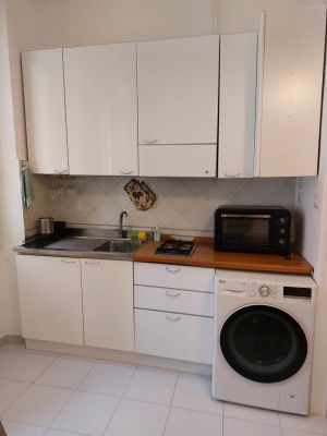 A bright living area with a furnished open kitchen with 2-burner stove, fridge, washing machine and dining table