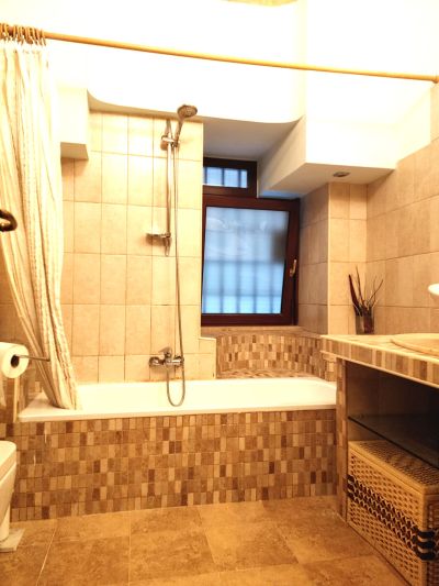 Bathroom with windows, with fine finishes and thermal glass. Vaulted ceiling with exposed bricks. Bathtub finished with a mosaic. Washbasin covered in marble. Dishwasher.