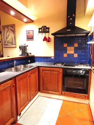 The corner bar/kitchen is furnished with cooking plan and two electric plates + fridge, electric oven and washbasin. It also includes a large storage.