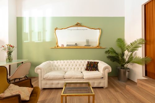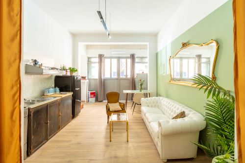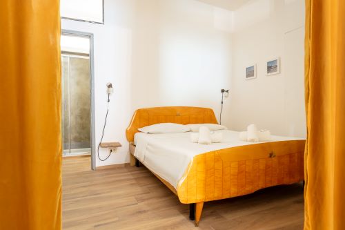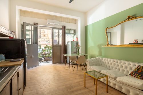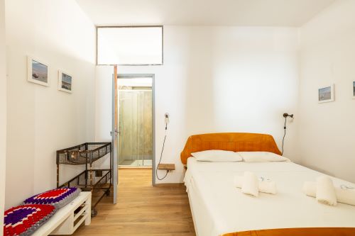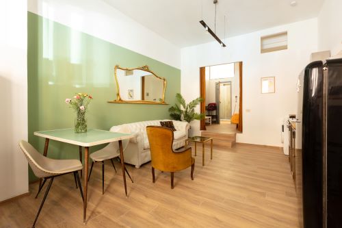 Fully equipped kitchen with a SMEG fridge, a king size bed 160x200, a Chesterfield sofa (sofabed) for extra guests and a spacious bathroom with large shower.