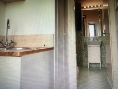 The property features a spacious room with an attached living area and a beautiful coffered ceiling, a bathroom with laundry facilities, and a small kitchen equipped with all necessary amenities.