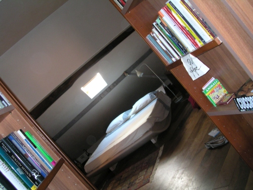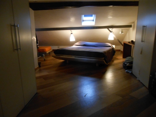Upstairs: Light and quiet, surprisingly, 100 sqm top floor flat + 30 sqm sunny private terrace exposed to the South West. Full of light.