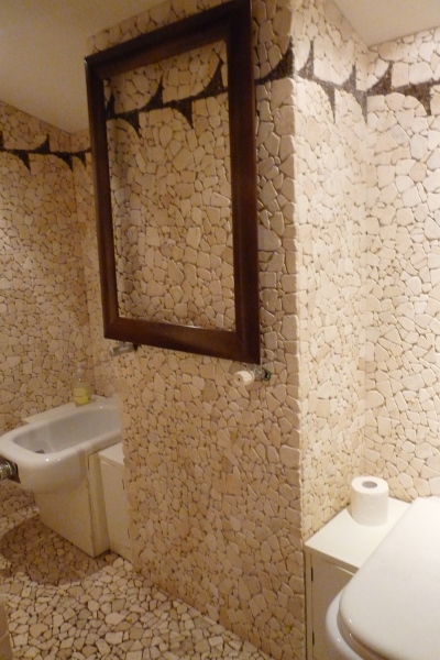 Living-room giving onto the terrace, with original Pompadour marble fireplace in working condition. Boiserie library avec secret trompe-l’oeil door opening onto the sleeping area. Vast pear-wood cupboards at the entrance. Master bed under the original 15th century beams with skylight. Child's corner with additional bed space and roof window. Travertine marble mosaics in the bathroom; vault with steam-bath and showers. There is also an hammam.