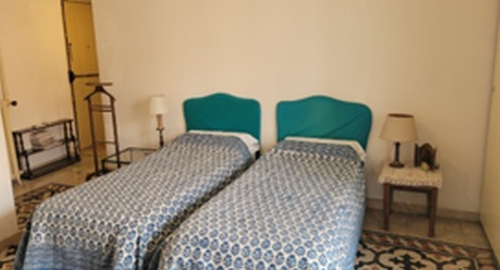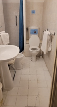 One room with twin beds, bathroom with shower and small balcony.