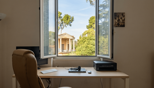 •Smart-Working Station: Desk setup featuring a window that frames a quiet, green view of classical architecture.