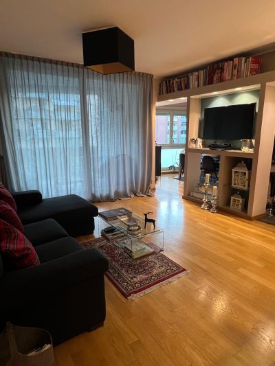 Located on the fifth floor, the apartment has been fully renovated. It is tastefully furnished and has all the comforts you need. The layout is practical and well-designed. The living area includes a comfortable sofa bed and opens onto a large balcony. The dining area has a modern extendable table. A stylish room divider with a TV separates the living and dining spaces. The kitchen is fully equipped, including a wine cellar. The bathroom has a window and a shower. The master bedroom has a double bed and a walk-in closet. In the hallway, there is a large built-in shoe rack. The apartment is in excellent condition and finished with quality materials: