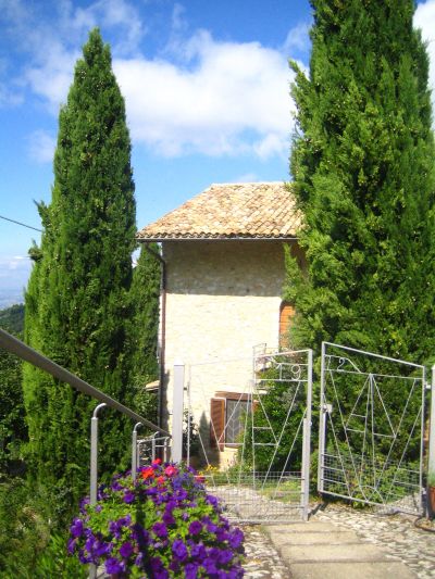 Tastefully renovated country house in the countryside high above the Umbrian plain between Assisi, Valnerina, and the Staufer town of Spoleto in a real Sleeping Beauty land for lovers of nature, the arts, and history. Rosemary, lavender, bougainvillea, and roses on a large terrace; outdoor seating area with breathtaking views, cypress trees, pine tree with viewing platform, cistern, and small fountain. 100 olive trees provide typical Umbrian oil for friends and family every year. Inside, two wood-burning stoves (despite central heating) provide warmth, contemplation, and comfort. Cherry wood kitchen, pear wood dining room, high, open living room with gallery for writing. Two bedrooms, 3 bathrooms, guest/children's loft under the roof. Ideal as a retreat, vacation home, or even as a permanent residence.