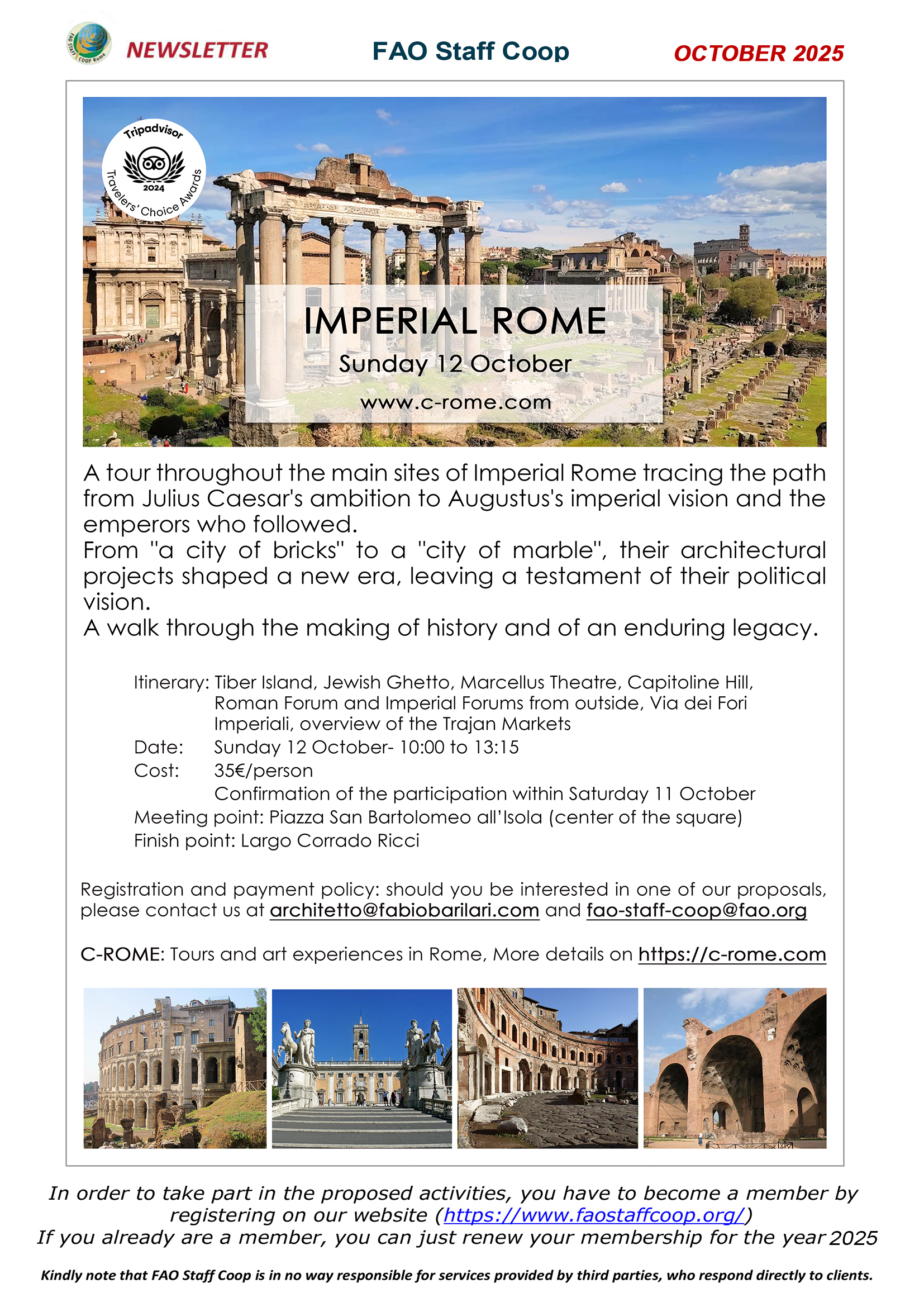 - Sunday, October 12: IMPERIAL ROME guided tour, organized by Mr. Fabio Barilari and his “C-Rome” - READ MORE