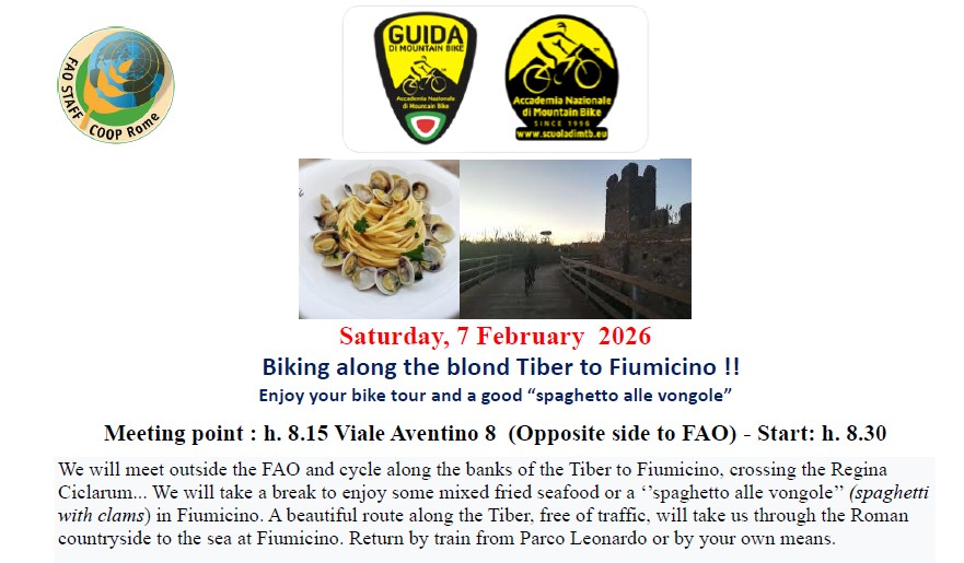 We will meet outside the FAO and cycle along the banks of the Tiber to Fiumicino, crossing the Regina
