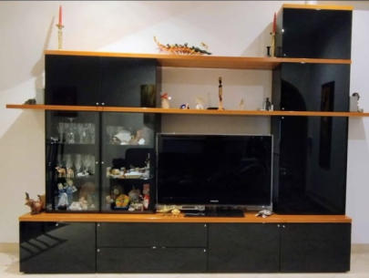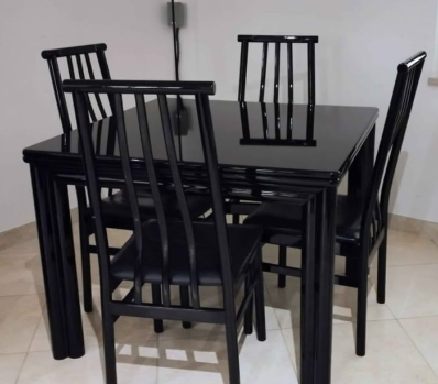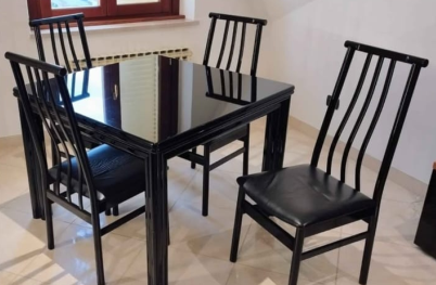 with 1 m x 1 m table, extendable up to 2 meters, 4 chairs with leather seats.