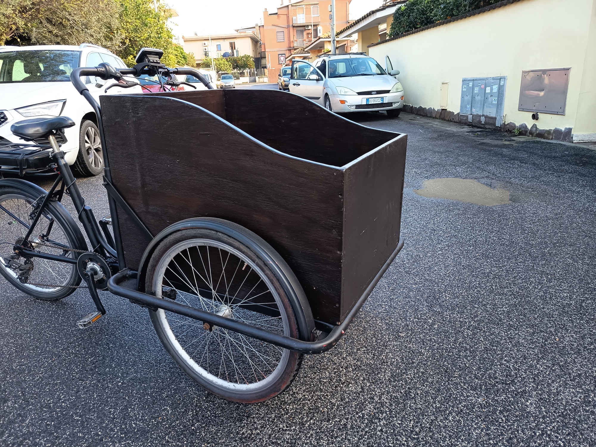 Cargo box suitable for transporting children (I used to stroll my two kids around the city center), pets, or goods; very stable and safe. Recently serviced and ready to ride, in good overall condition; may require minor optional adjustments.